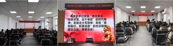 理论学习有深度。食品学院各级团组织积极围绕“学习二十大、永远跟党走、奋进新征程”的主题,以学生组织和团支部为基本单元,扎实开展学习贯彻习近平新时代中国特色社会主义思想主题教育,用党的创新理论武装团员青年。开展“学习党的二十大 知农爱农二十讲”主题宣讲活动,教育引导团员青年知农爱农、扎根基层。学生骨干召开“学习习近平总书记回信精神、强化科技小院使命担当”座谈会。各团支部持续开展“青年大学习”网上主题团课,以团课形式组织学习《习近平新时代中国特色社会主义思想专题摘编》、龙江高校云端读书班等,教育引导团员青年要以实际行动努力践行习近平总书记重要讲话精神,继承发扬北大荒精神,汇聚青春力量,奏响“食”代强音。