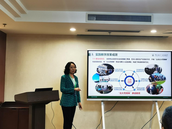 郑雯以“黑龙江八一农垦大学作物科学类专业实践教学改革成效”为题向与会代表介绍了我校农学类专业人才培养模式和实践教学改革成效建设,详细阐述了农学院坚持深入北大荒生产一线开展生产实践,并把弘扬北大荒精神社会实践与专业实践深度融合等创新做法,报告获得与会代表们的高度认可,也吸引了代表们对我校和北大荒集团发展的关注。