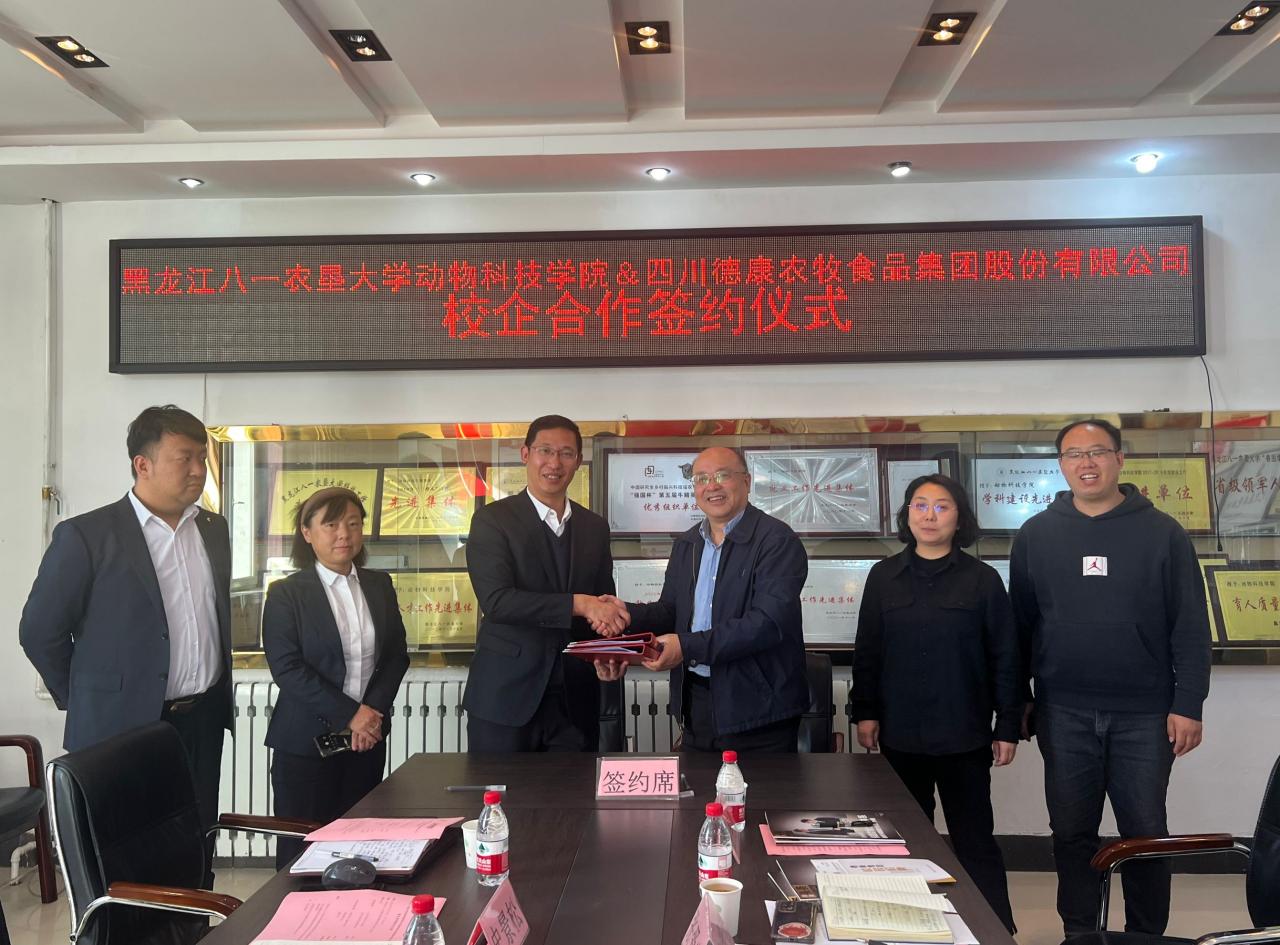 10月19日,动物科技学院与四川德康农牧食品集团举行校企合作签约仪式。德康集团北方区域总经理史景松、北方区域公司招聘主管张博识及相关部门负责人,动物科技学院党委书记张爱忠及相关教师参加签约仪式。