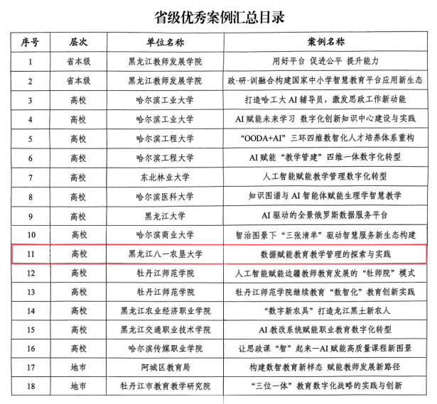 近日,黑龙江省教育服务中心公布了《2025年黑龙江省数字化赋能教育管理高质量发展应用优秀案例》,我校《数据赋能教育教学管理的探索与实践》成功入选省级优秀案例,成为全省11所入选高校之一。