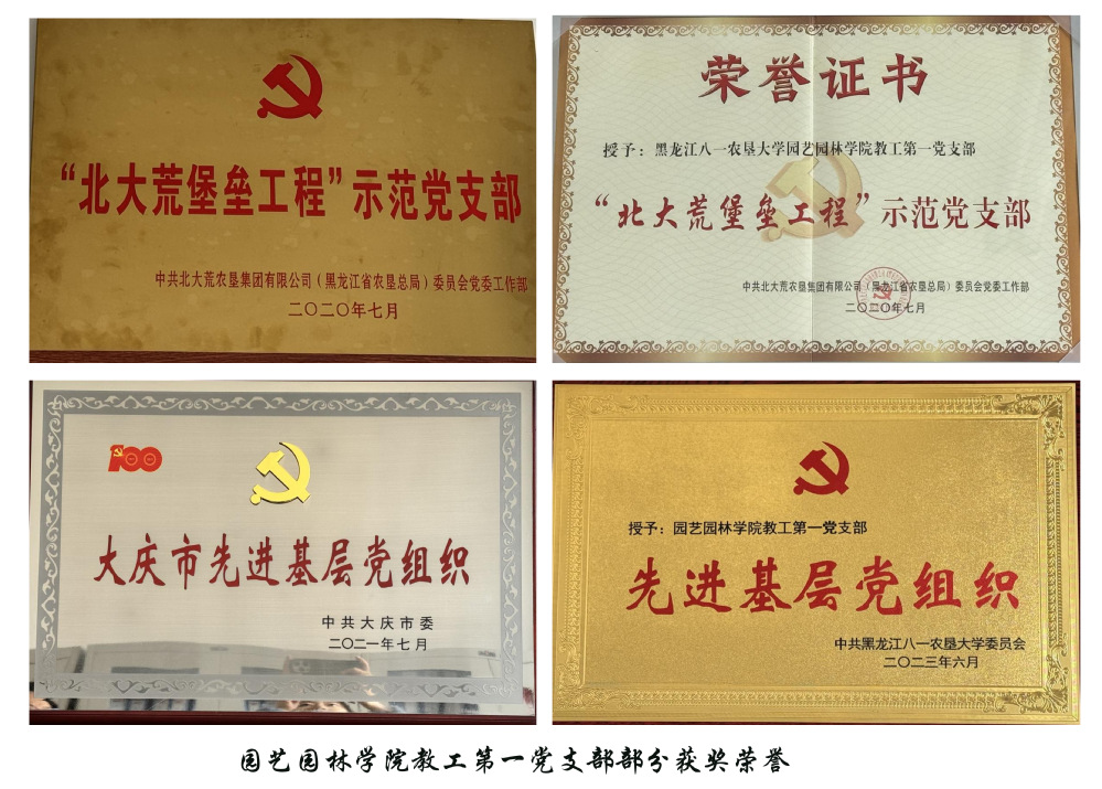 党支部先后荣获全国高校“两学一做”风采展示党支部、全省高校“百优”党支部、“北大荒堡垒工程”示范党支部、大庆市先进基层党组织、校先进基层党组织,全省公办高校党建“样板支部”培育创建单位、全省高校“双带头人”教师党支部书记“强国行”专项行动团队、第二批全省高校“双带头人”教师党支部书记工作室创建培育单位等称号,撰写的《以北大荒精神为基打造“四型”党支部堡垒》工作案例荣获全省高校党建与业务工作融合优秀案例。支部党员获全国生态建设突出贡献先进个人1人;获黑龙江省优秀教师2人、省优秀共产党员1人、省优秀创业导师1人、省绿化奖章1人;获大庆市优秀党务工作者1人、市巾帼标兵1人、市民族团结先进个人1人;获校优秀党务工作者2人、校优秀共产党员2人、校优秀教师2人、校就业育人先进个人2人、校教育突出贡献奖1人、获校创新大赛优秀指导教师1人、校三全育人先进个人1人。