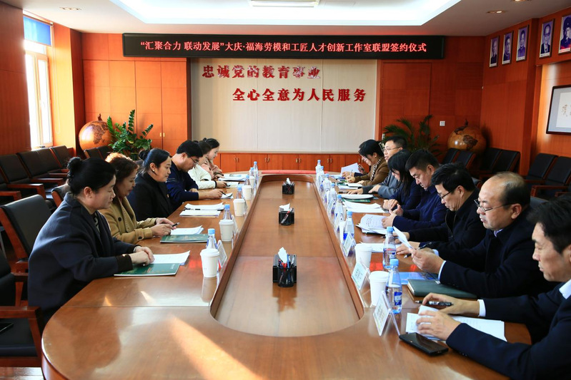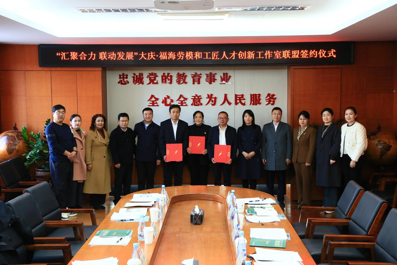 10月16日下午,大庆·福海劳模和工匠创新工作室联盟签约仪式在主楼907举行。学校党委副书记、工会主席高宏,大庆市总工会党组书记、副主席贾辉,福海县总工会党组副书记、主席阿丽玛·克列斯,杜尔伯特蒙古族自治县人大副主任、县总工会主席曲咏参加仪式。仪式由大庆市总工会副主席孙凯主持。