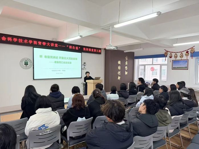 为引导青年学子传承红色基因,深刻感悟北大荒精神的时代内涵,生命科学技术学院于11月5日,在学生公寓1、2号连廊一站式学生社区举办“师生说”快闪课堂第三期。本次课堂特邀马克思主义学院副教授齐艳娟老师担任主讲,通过讲述多位北大荒老垦荒的鲜活故事,结合北大荒精神的价值与时代内涵,为同学们带来了一场深刻的精神洗礼。