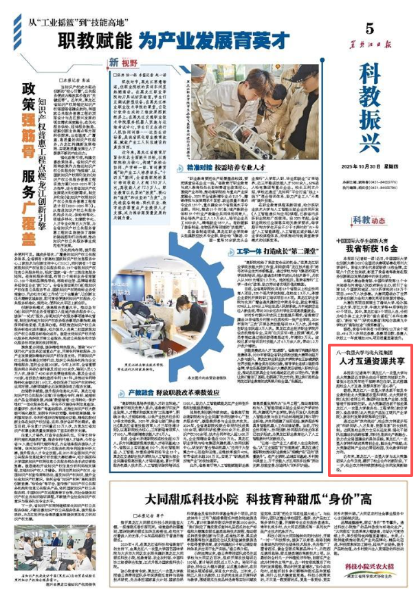通过这种“双向流动”,校企双方将逐步形成“科研共研、人才共育、资源共享”的长效机制。这既是校企双方立足长远发展、强化干部队伍建设的战略部署,同时也是深化产教融合、助力农业强国建设的具体实践,黑龙江八一农垦大学将科研成果带到企业,解决生产难题;北大荒集团将产业动态带回校园,优化教学科研方向。