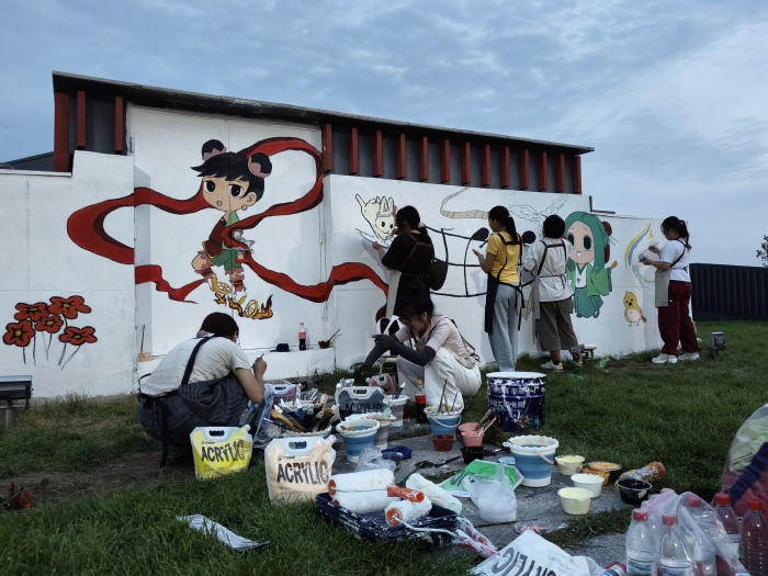 自大赛启动以来,学院参赛师生便全身心投入其中。在学院教师的专业指导下,学生团队严谨认真地开展前期工作,从实地测量每一寸墙面,到精心设计效果图,每一步都凝聚着团队的智慧与心血,他们充分发挥专业所长,将园艺园林元素与城市文化特色相结合,以独特的艺术视角和精湛的涂鸦技艺,勾勒出一幅幅兼具创意与内涵的作品。历经49个日夜的辛勤努力,一幅总面积达186平方米的大型涂鸦作品惊艳亮相。这幅作品不仅将课堂所学的空间尺度把控、色彩构成等理论知识巧妙转化为生动的实践成果,更以独特的艺术视角和丰富的文化内涵,打造出一个兼具观赏性与情感共鸣的城市文化空间。吸引着市民们纷纷驻足欣赏,成为大庆市一道亮丽的风景线。其卓越的表现也获得了《大庆晚报》《青春大庆》等多家媒体的关注与报道,为城市文化建设增添了浓墨重彩的一笔。
