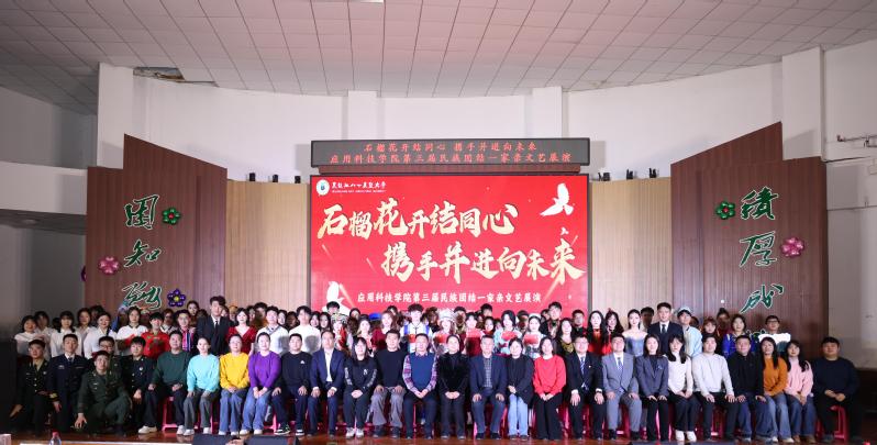 为深入学习贯彻党的二十届四中全会精神,扎实推进民族团结进步教育走深走实,持续铸牢中华民族共同体意识,12月6日,应用科技学院第三届“民族团结一家亲”文艺展演暨铸牢中华民族共同体意识成果展在大学生活动中心举行。学校党委宣传部(统战部)、学生工作部(学生处、武装部)、招生就业处相关部门负责人,各学院团委书记、辅导员代表以及全校400余名师生欢聚一堂,以歌舞传情、以成果聚力,共同谱写民族团结进步的青春华章。