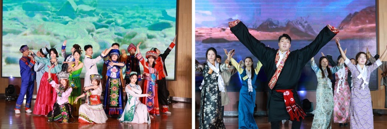 本次展演以“石榴花开结同心 携手并进向未来”为主题,在《民族团结进步工作回顾》短片中拉开序幕。短片系统呈现了应用学院近年来在民族团结教育、民族文化传承等方面的扎实举措与丰硕成果,为整场活动奠定了厚重温暖的基调。展演通过“同心筑梦·石榴籽”“同心奋进·新征程”“同心绽放·向未来”三个篇章,以舞蹈、歌曲、情景剧、武术、灯影剧等多元艺术形式,生动展现各民族文化的交融共生,诠释新时代青年的责任担当与奋进姿态。