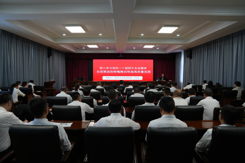 当天,李志有面向浩特陶海农牧场有限公司领导班子成员、机关全体人员及各连(队)管理人员作党的二十届四中全会精神专题宣讲,此次宣讲亦是双方党建结对共建的预热首讲。李志有围绕全会基本概况、公报核心内容展开解读,梳理“十四五”时期我国发展取得的重大成就以及“十五五”时期的战略定位与发展原则,结合企业发展实际,聚焦“强根固魂、政治统领、深化改革、锚定目标、勇担使命”五大发展路径,剖析如何将党的领导贯穿企业发展全过程,助力参会人员深刻领会党的二十届四中全会精神的实践内涵。