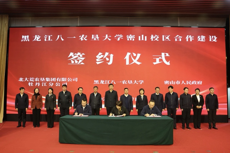黑龙江八一农垦大学校长李翠霞、密山市人民政府市长王士强、北大荒农垦集团牡丹江分公司总经理于海军分别代表校、地、垦三方签署战略合作办学框架协议。