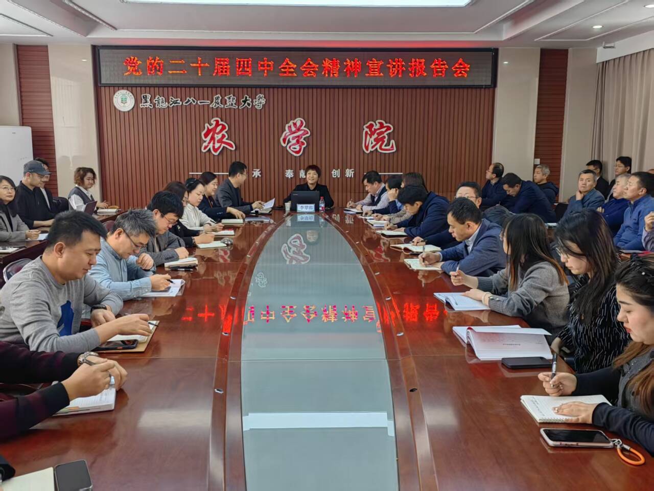 为深入学习宣传贯彻党的二十届四中全会精神,1月12日下午,校长李翠霞在农学院4001会议室进行宣讲。农学院党委书记姜楠主持会议,校人事处党支部全体党员、农学院全体教职工、学生党员代表参会。
