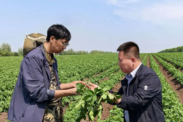 8月中旬,作为哈尔滨百亩庭农业发展有限公司的“科技总师”,金光辉老师到双城市进行马铃薯种植技术指导服务。该公司以垦薯1号为主栽品种,因高温出现了“串箭”现象,导致结薯晚、大薯率下降的情况,而且植株长势过旺,发生了徒长等现象。金老师及时给与技术指导,并通过一系列技术措施,使马铃薯增加了结薯个数,最终亩产达到了4吨以上。