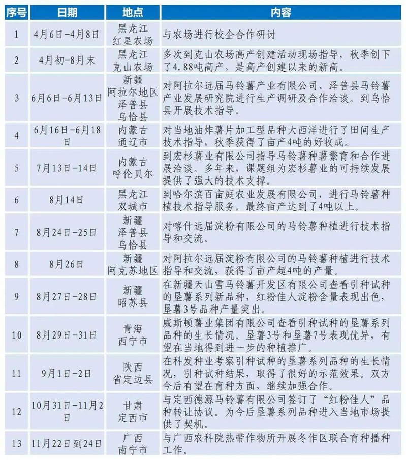 近年来,金光辉团队推广马铃薯“垦薯”系列品种和“红粉佳人”,深受祖国南北种植户和马铃薯企业的青睐。2024年,对河北、内蒙古部分区域进行了授权。2025年春天,对辽宁部分地区进行了授权,同时引种到内蒙古锡林郭勒盟和新疆阿克苏地区、阿拉尔市、伊犁哈萨克自治州、喀什地区等地。
