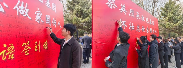 活动现场庄严肃穆,烈士纪念碑巍然矗立。活动开始前,参会师生在主题背景板前有序签到,郑重写下对革命先烈的缅怀寄语。一句句深情告白、一声声真诚告慰,寄托着对英烈的无限追思,彰显着新时代青年传承红色血脉、勇担时代使命的坚定信念。